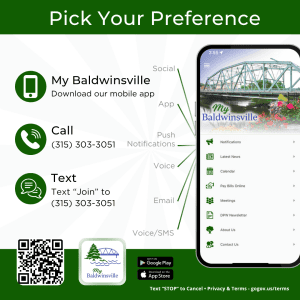 The app is a great resource of information for news, events, updates, services interruptions and important links to our website. The app is available (for free) to download in the Apple App and Google Play online stores. Download “My Baldwinsville” now to get started.